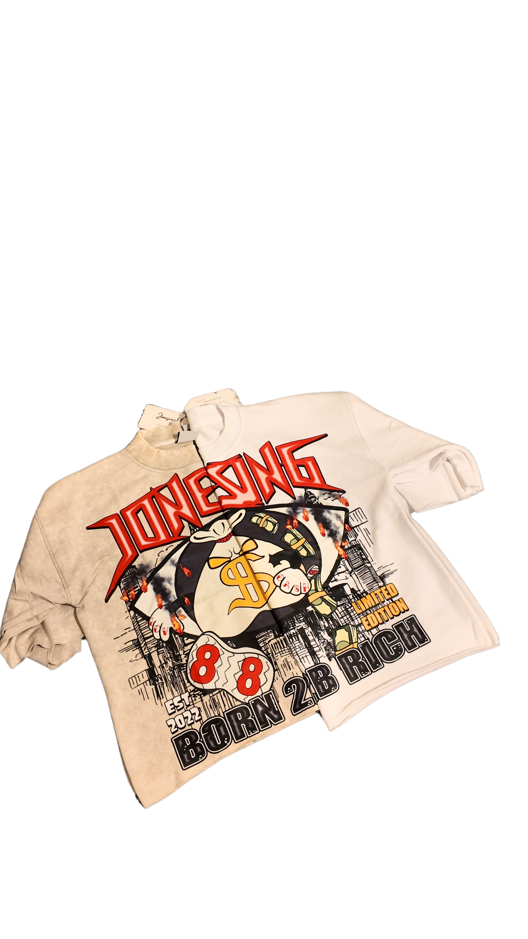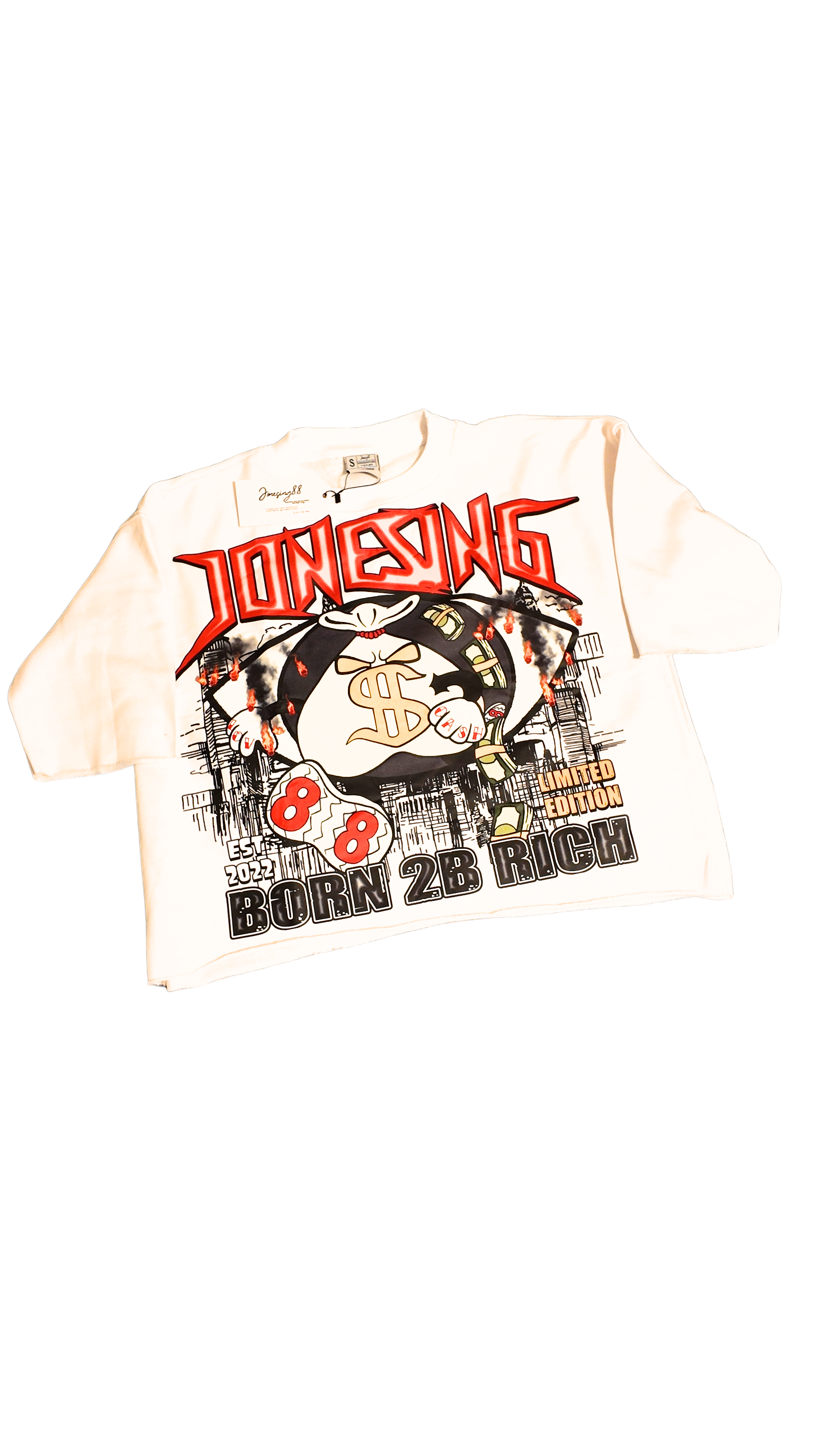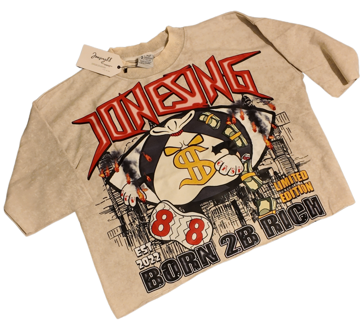Get ready to feel like the luckiest person on the planet with our Born 2B Rich cropped tee! Made from heavy weight French Terry cotton, this unisex top is designed for style and comfort. The sand wash or the white would add a touch of swag to any look. Take your wardrobe to the next level with Born 2B Rich!l